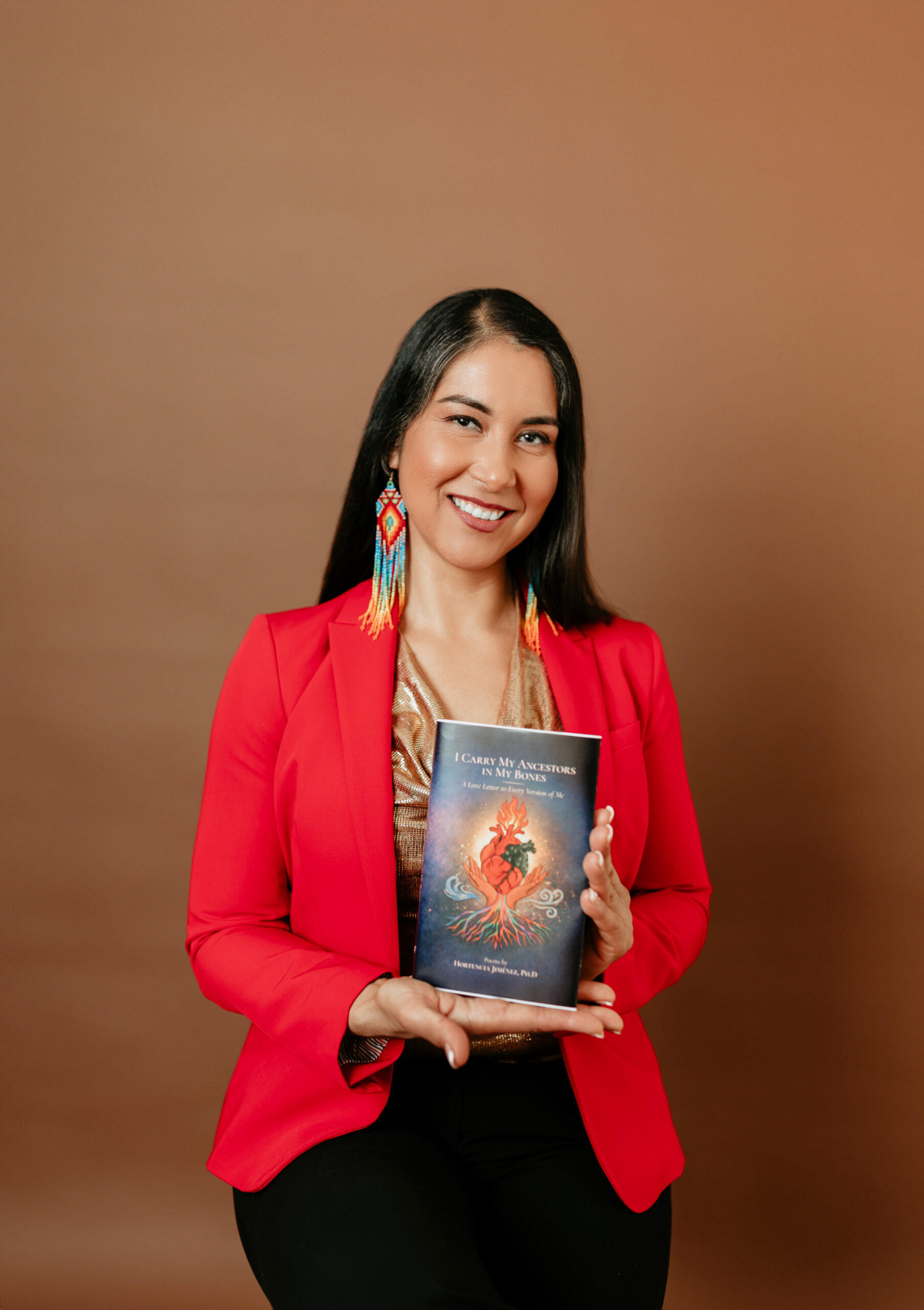 A queer Mexican immigrant of Wixárika ancestry, professor, author, podcaster, and mother, Jiménez writes from the intersections of migration, queerness, academia, motherhood, and healing. Born in the Sierra Madre of Nayarit, Mexico and raised in the United States, her poems move between English, Spanish, and Spanglish, between heartbreak and joy, between survival and liberation. They trace a journey from abandonment, shame, and silence toward reclamation, embodiment, and belonging.